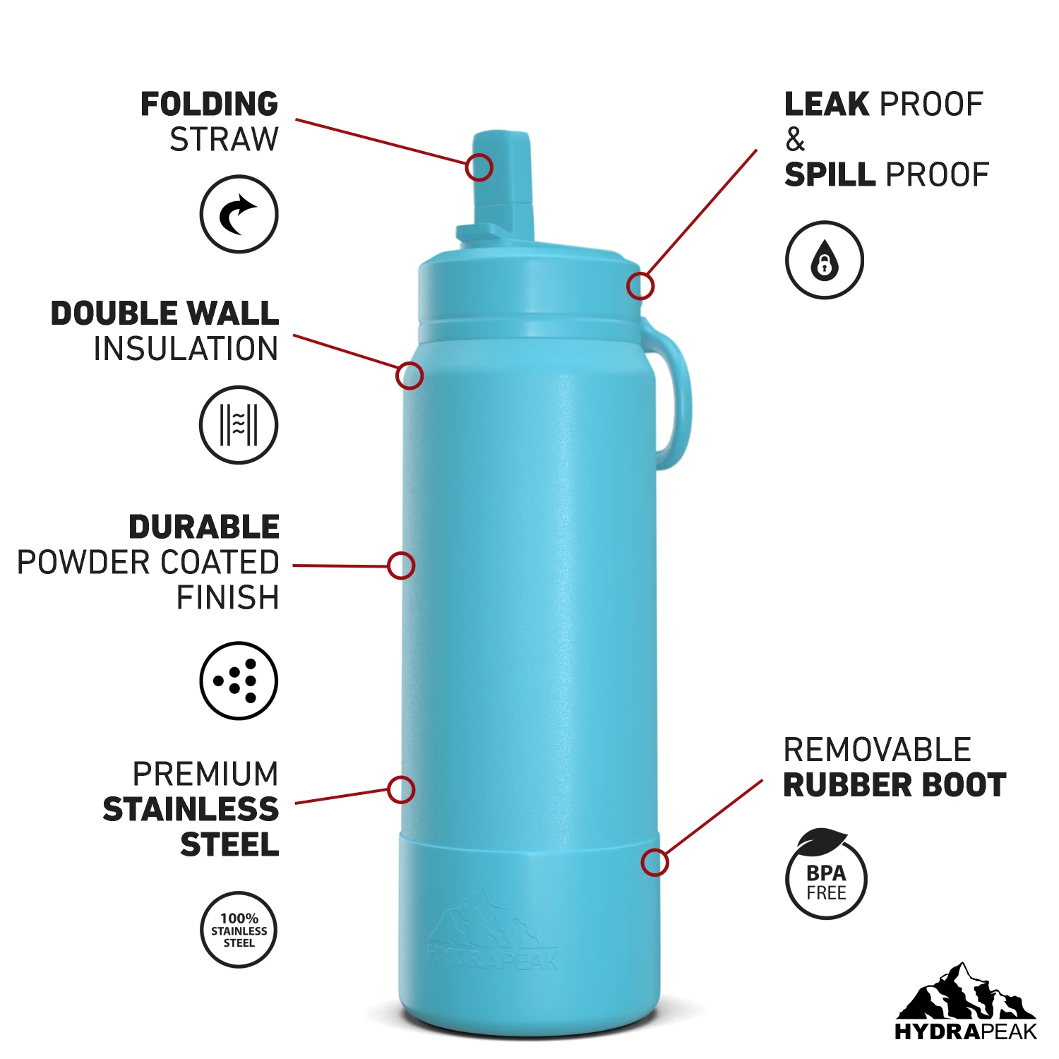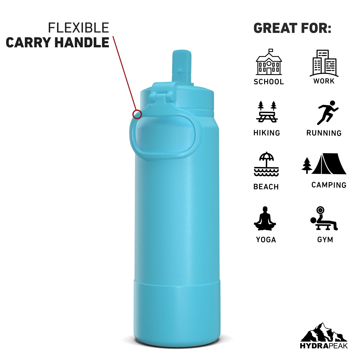 - The Hydrapeak sports water bottle comes in a variety of aesthetic colors and sizes to choose from. Our metal water bottle comes in 26oz, 32oz, and 40oz sizes, making it a great kids water bottle and an adults water bottle.