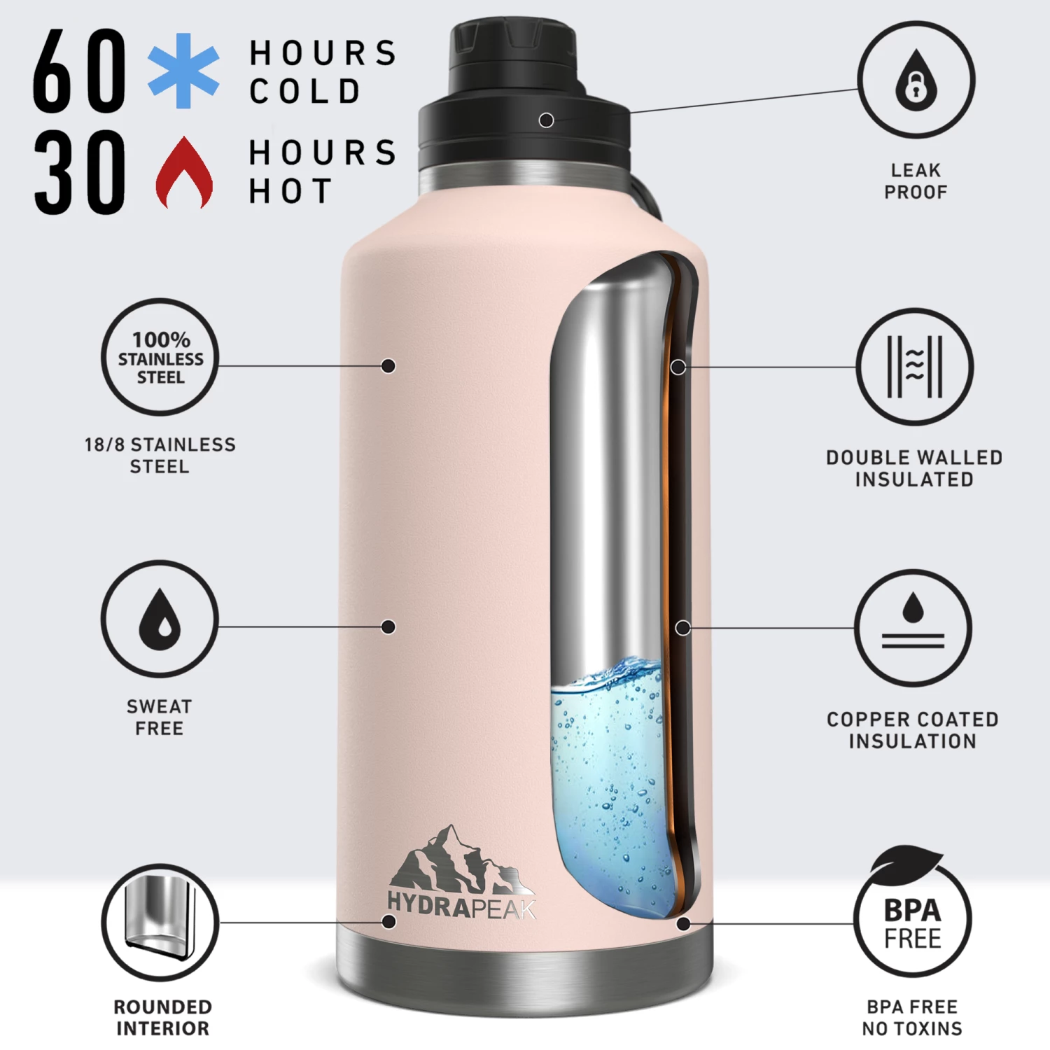 - ALL DAY INSULATION; This big water bottle will keep your drinks cold for up to 60 hours, and hot for up to 30 thanks to Hydrapeak’s vacuum insulated double walled stainless steel, These jugs are great for sports, the gym, outdoors, school, and more