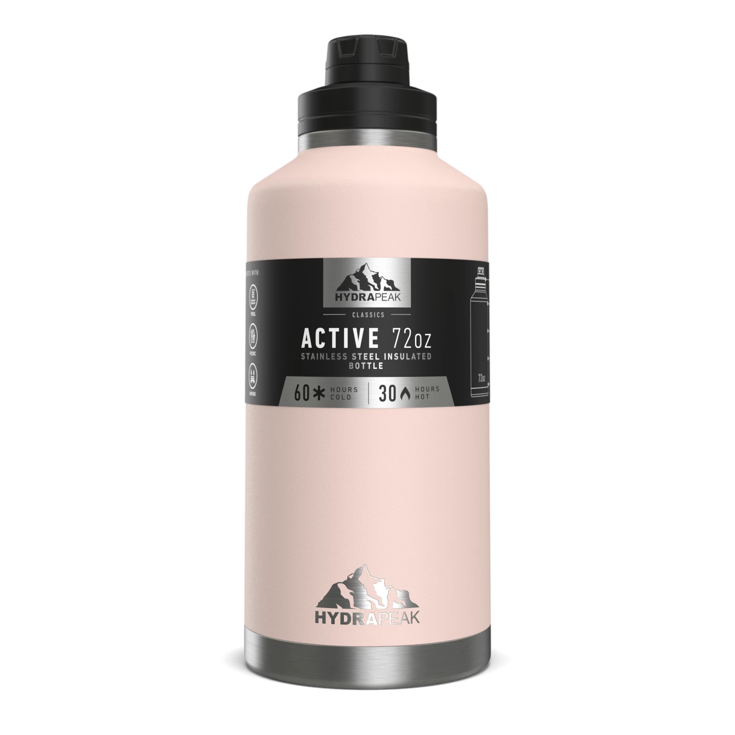 - OUR BIGGEST BOTTLE YET; Go one step up from a regular 64 oz water bottle with Hydrapeak’s 72 oz stainless steel water bottles! This Jug is capable of holding AND insulating over half a gallon of water or your favorite beverage all day long