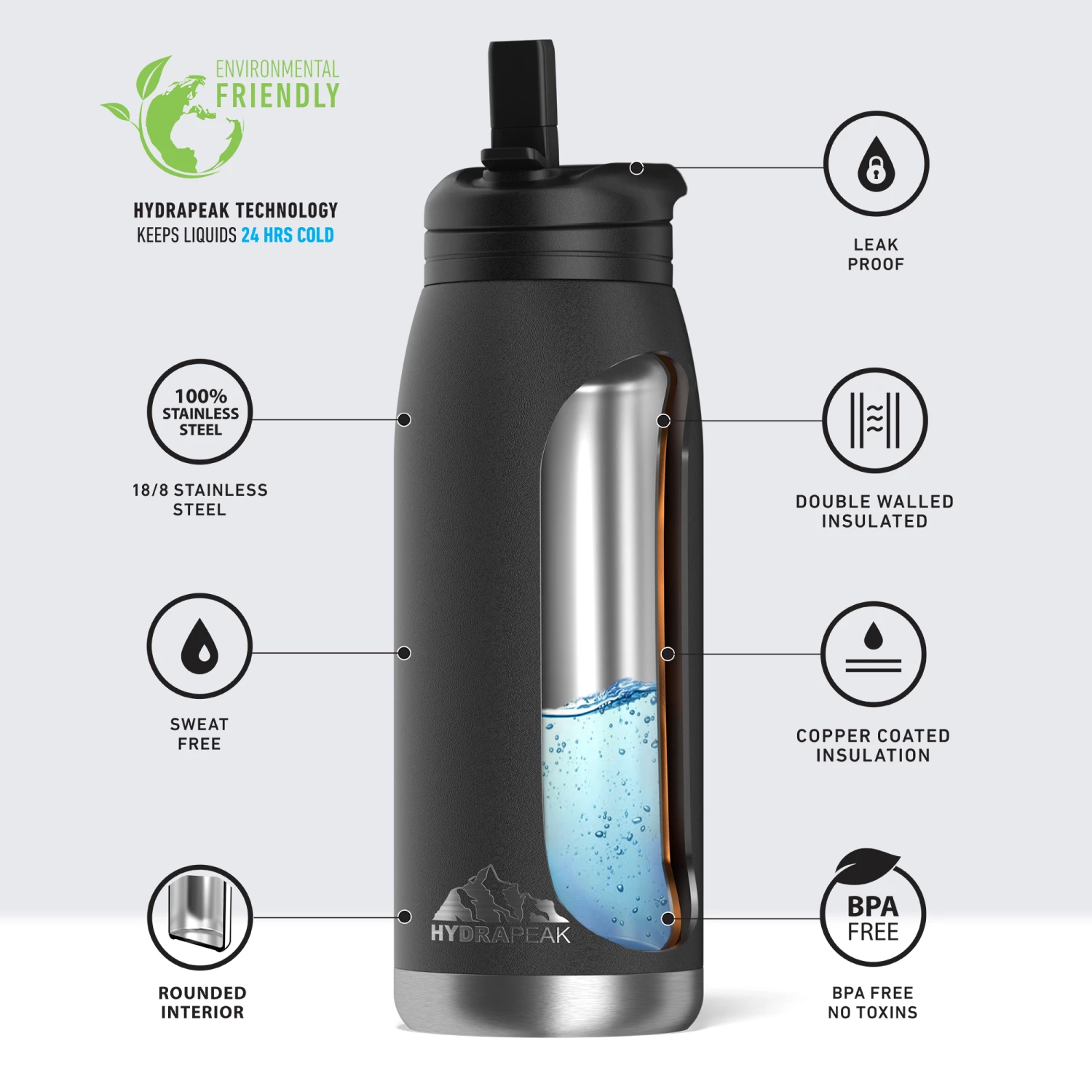 Looking for a perfect 32oz, all-day hydration, insulated liquid container that will keep your tasty beverage cold or hot for extra-long hours. Are you also looking for the purest refreshment that will be “good to the last sip” guaranteed, then HydraPeak Flow is your #1 choice. HYDRAPEAK Flow water bottles are constructed from the outside with stainless-steel, while inner is double vacuumed insulated with a layer of copper to reduce the transfer of temperature, doubling your insulation.