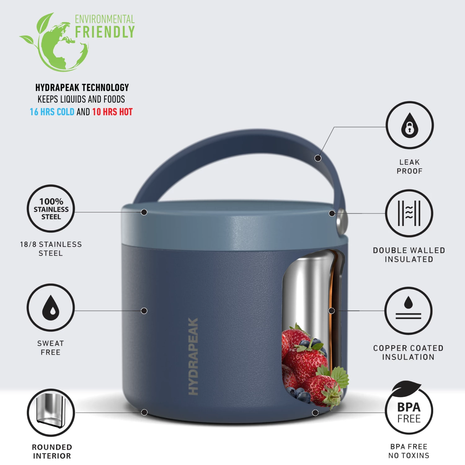 - ALL DAY INSULATION; Hydrapeak’s double wall vacuum insulation technology helps their insulated food container keep contents HOT for 10 HOURS, and COLD for 16 HOURS, making it the perfect thermos lunch box for kids, taking to school, or to the office