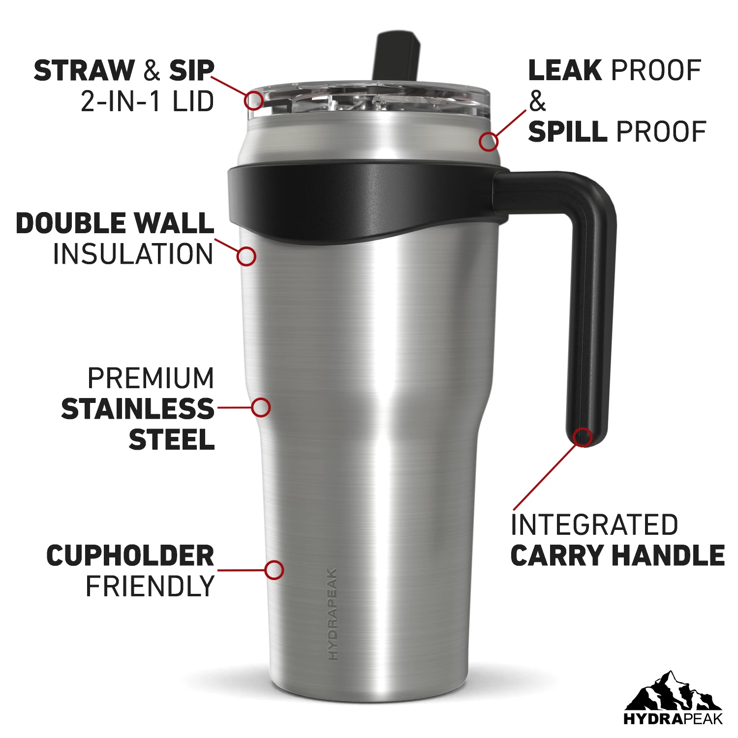 - LEAK-PROOF and SWEAT-PROOF; Hydrapeak created this 40 oz tumbler so that whatever you put in it, stays in, No more worrying about leaks, spills, or sweating, thanks to the innovative design of this insulated coffee mug with handle