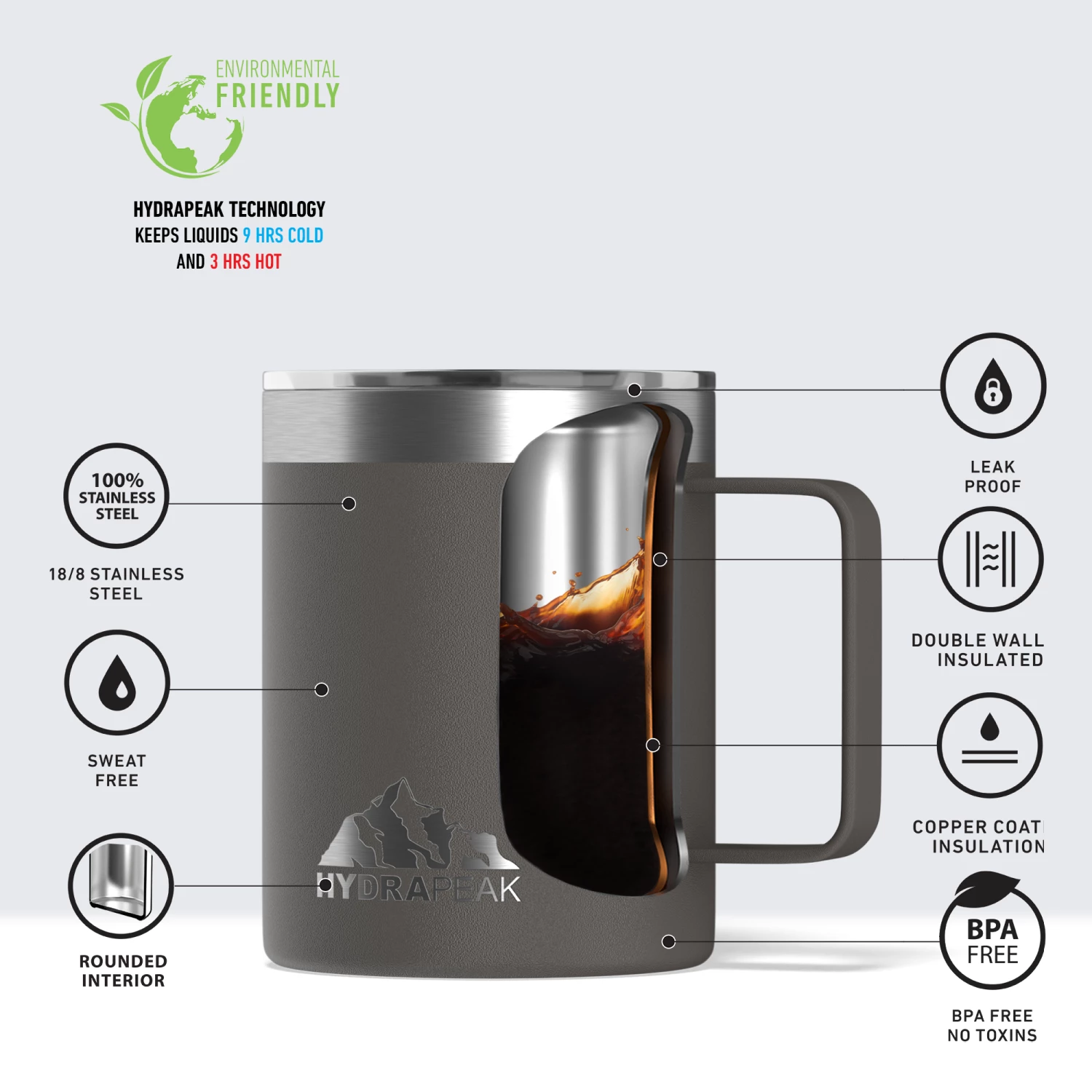 The NEW lightweight 18-ounce coffee mug is perfect for camping, tailgating, and picnics. Whether you’re sipping coffee, tea, cold brew you can enjoy the moment anytime anywhere and everywhere with Hydrapeak 18oz stainless steel double vacuum Insulated drinking mug with sliding lid. Grab a refreshing drink at the campsite, BBQ or picnic with an impact resistant shatterproof Hydrapeak 18oz stainless-steel hefty unbreakable reusable, in assortment colors, better than disposable plastic cups travel coffee mug.