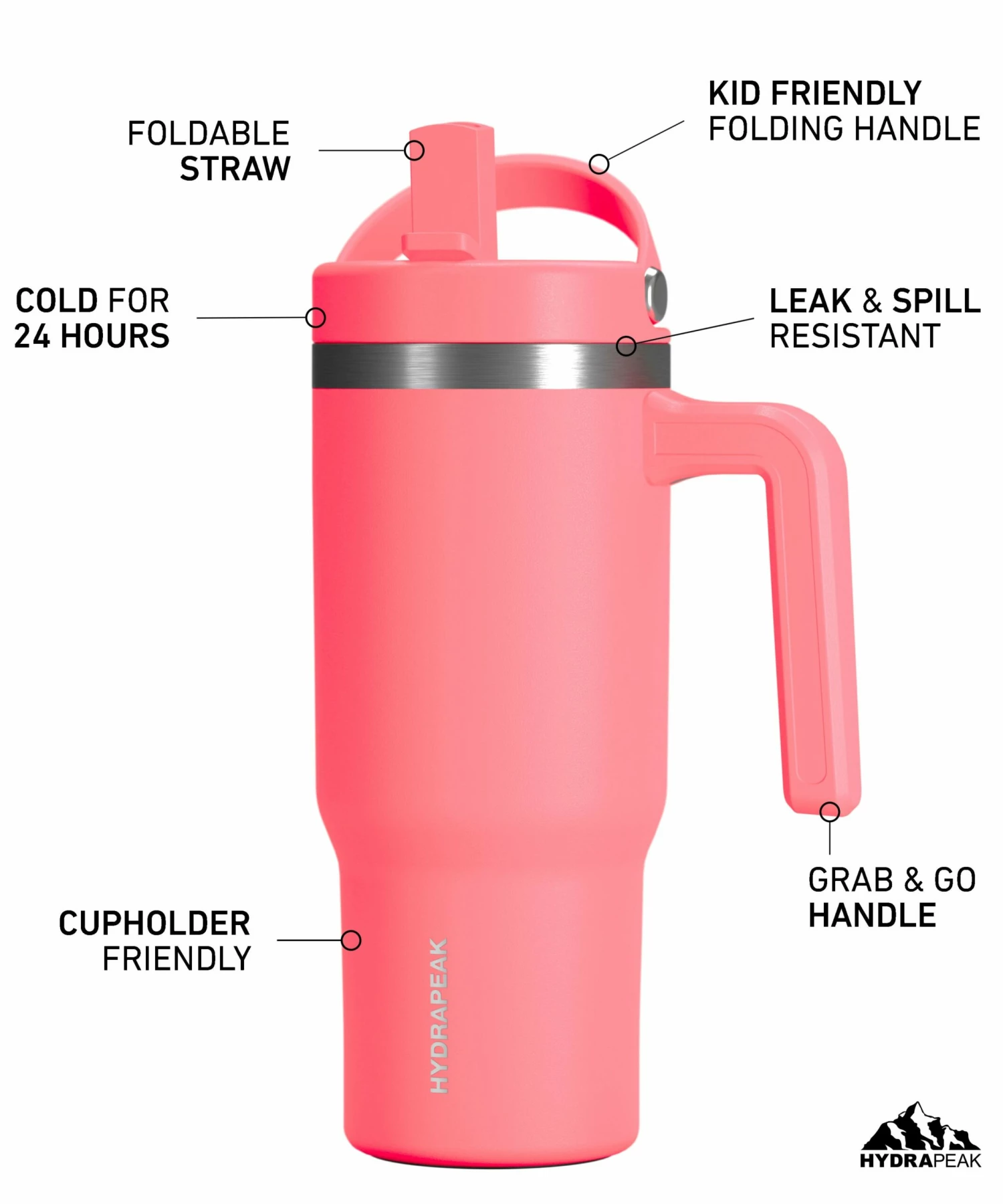 This Hydrapeak Insulated Tumbler with Straw and handle is made of high quality 18/8 food grade stainless steel that makes it sturdier, more durable, and ensures the cup remains odor-free. This travel cup was made to take everywhere and is perfect for kids and adults.